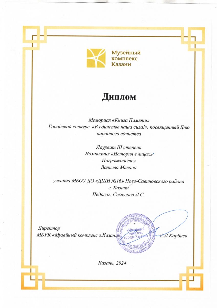 7. Валиева Милана городской конкурс «В единстве наша сила!» - лауреат 3 степени