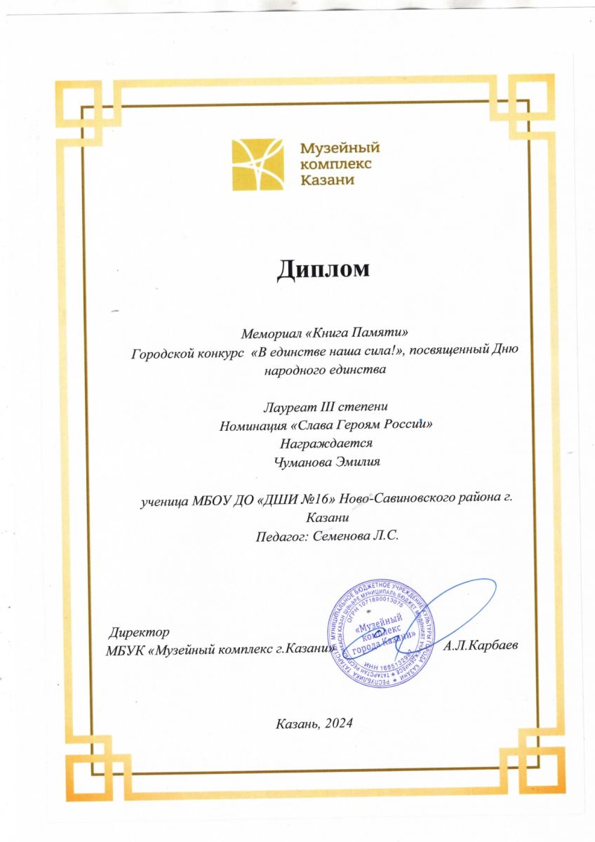9. Чуманова Эмилия городской конкурс «В единстве наша сила!» - лауреат 3 степени