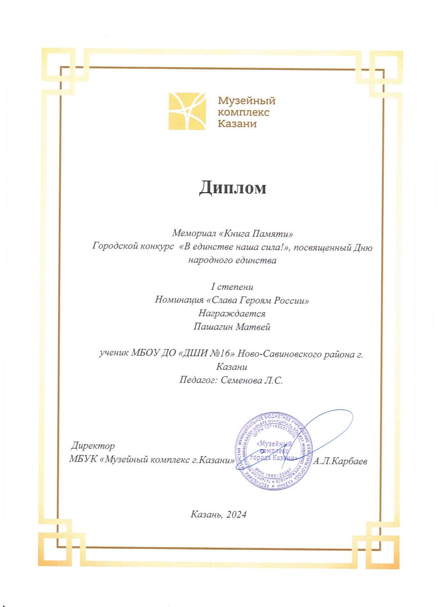 2. Пашагин Матвей городской конкурс «В единстве наша сила!» - диплом 1 степени