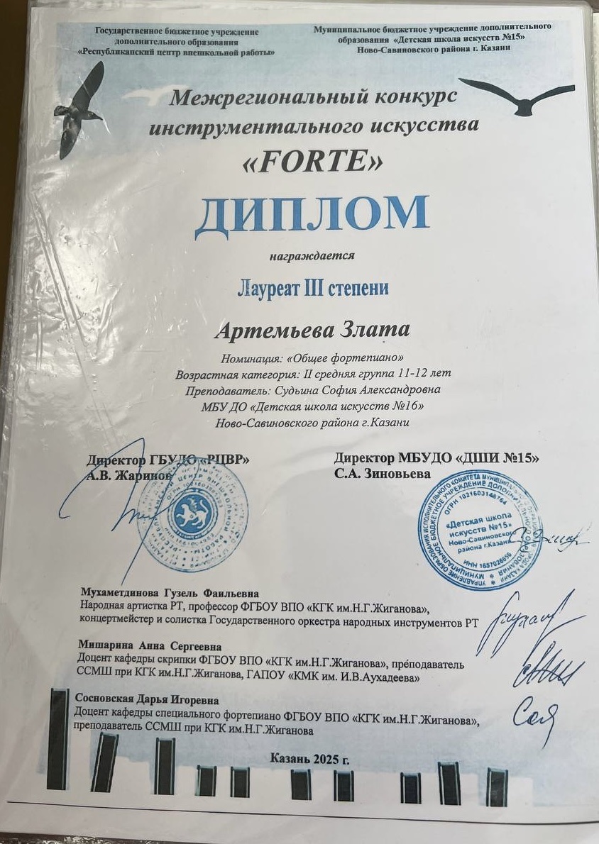 8. Загидуллина Саида - дипломант 1 степени. Межрегиональный конкурс инструментального искусства «FORTE»