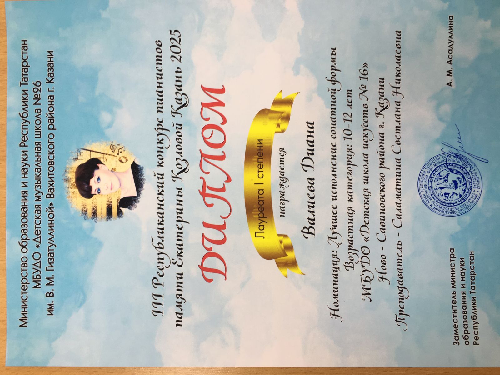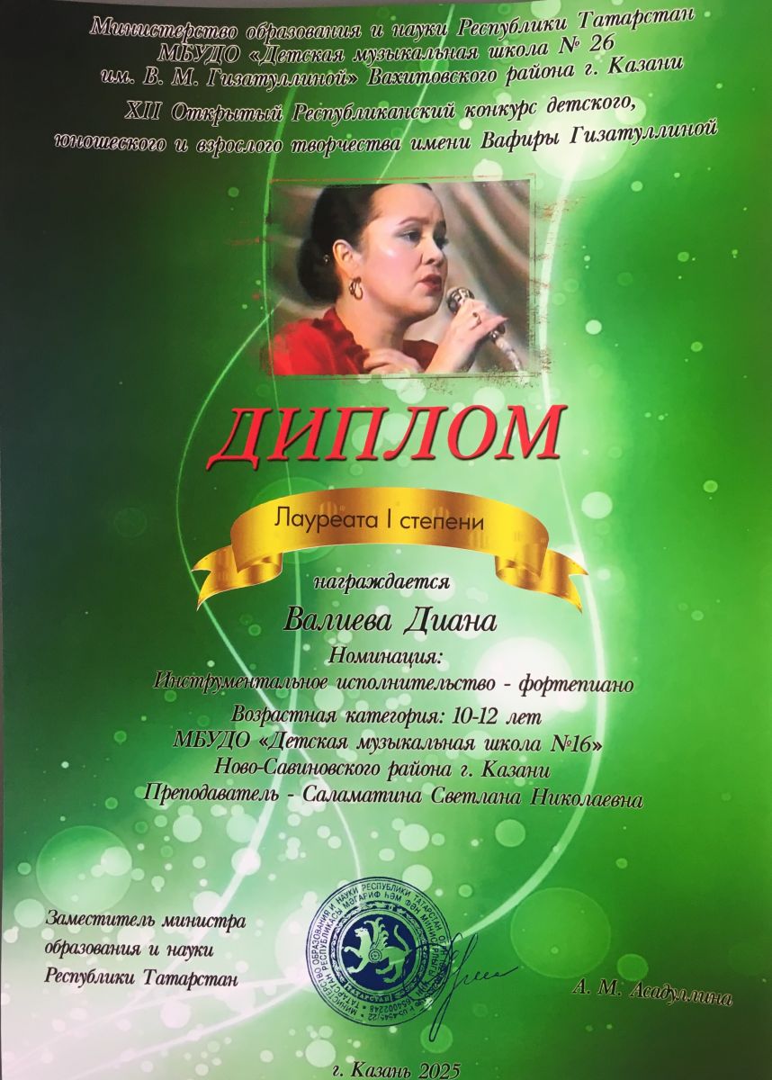 16. Валиева Диана - лауреат 1 степени. Республиканский конкурс имени В.М.Гизатуллиной