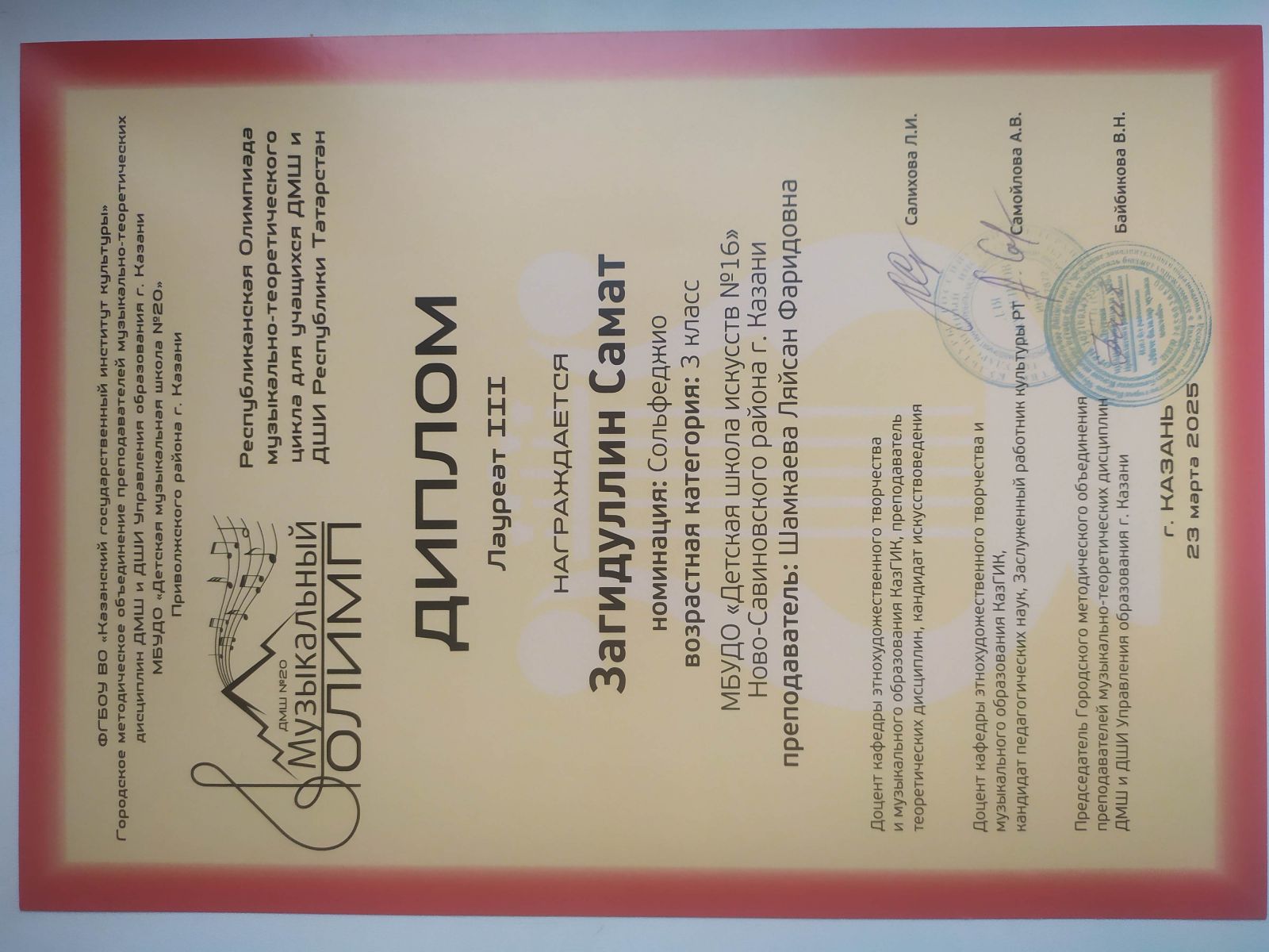 7. Мухамедшин Самир - диплом 3 степени. Республиканская олимпиада «Музыкальный олимп»
