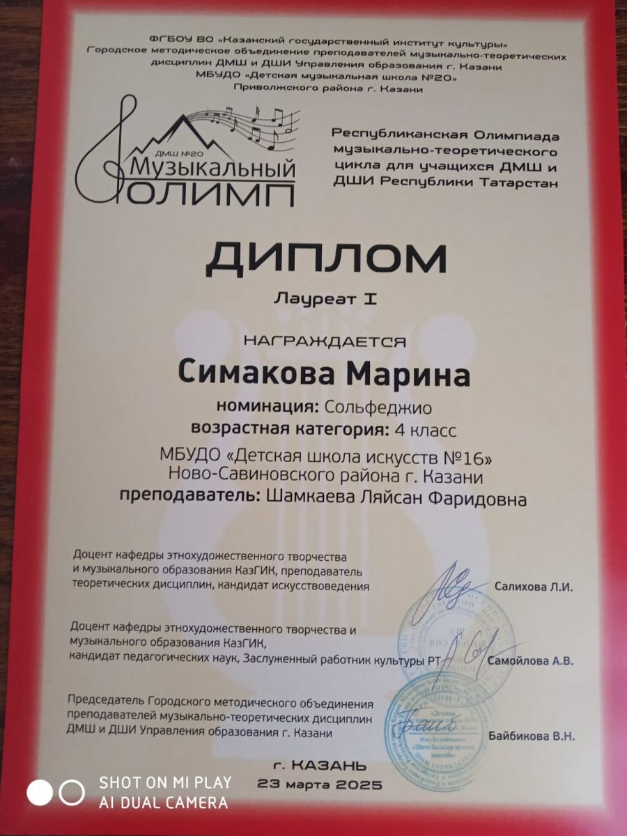 40. Симакова Марина - лауреат 1 степени. Республиканская олимпиада «Музыкальный олимп»