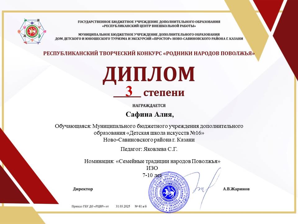 30. Сафина Алия. Диплом 3 степени. Республиканский творческий конкурс «Родники народов Поволжья»