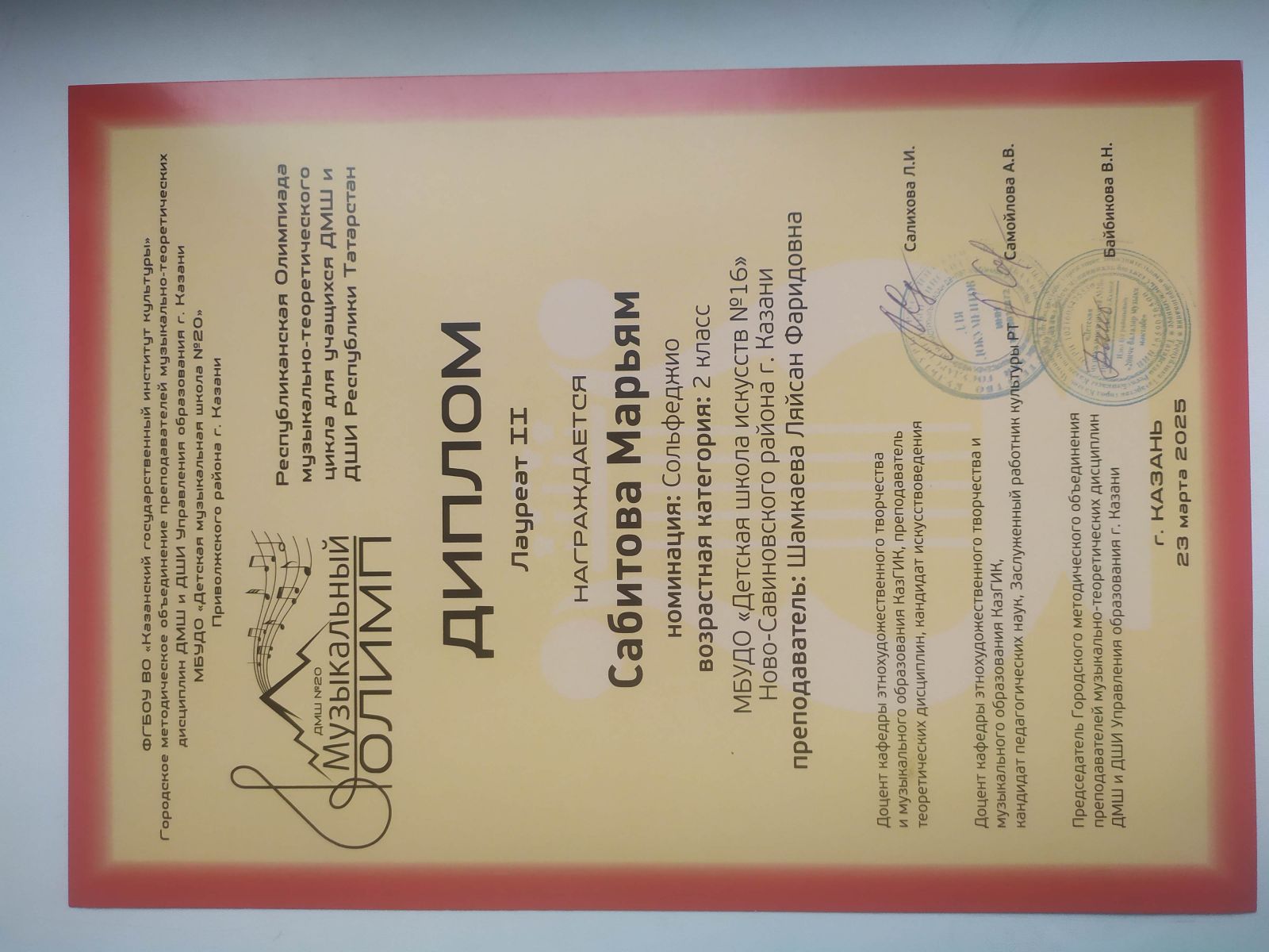47. Сабитова Марьям - лауреат 2 степени. Республиканская олимпиада «Музыкальный олимп»