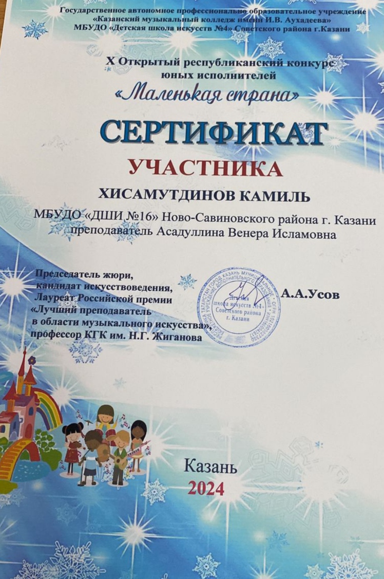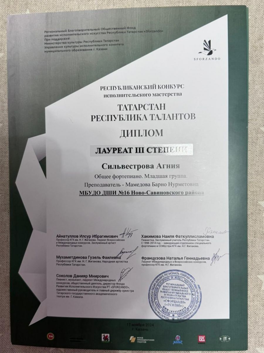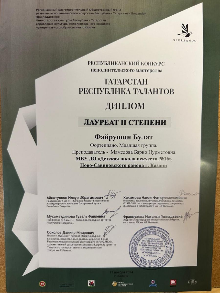 6. Асадуллин Ирек, Асадуллина В.И. -лауреат 3 степени. VI Республиканский конкурс «Музыкальная семья» в рамках республиканского конкурса детского творчества 100/лица