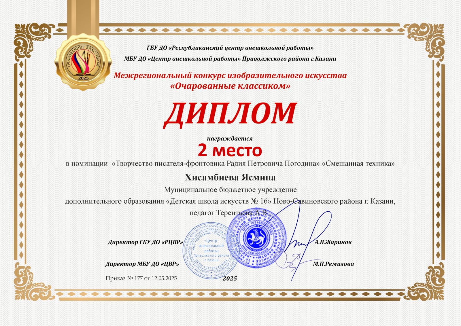 63. Хисамбиева Ясмина - Диплом. 2 место. Межрегиональный конкурс изобразительного искусства «Очарованные классиком»