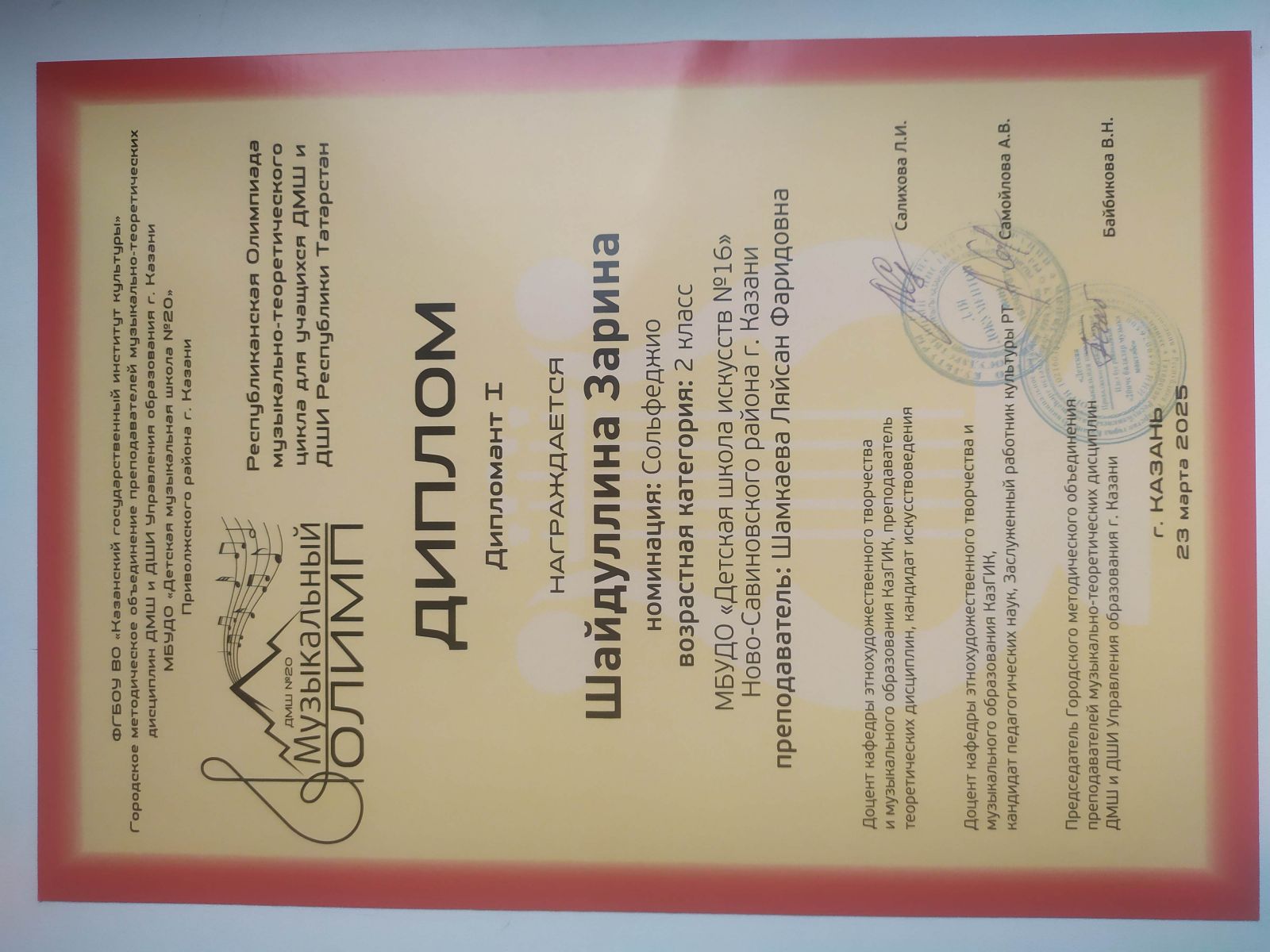 5. Шайдуллина Зарина - диплом 1 степени. Республиканская олимпиада «Музыкальный олимп»