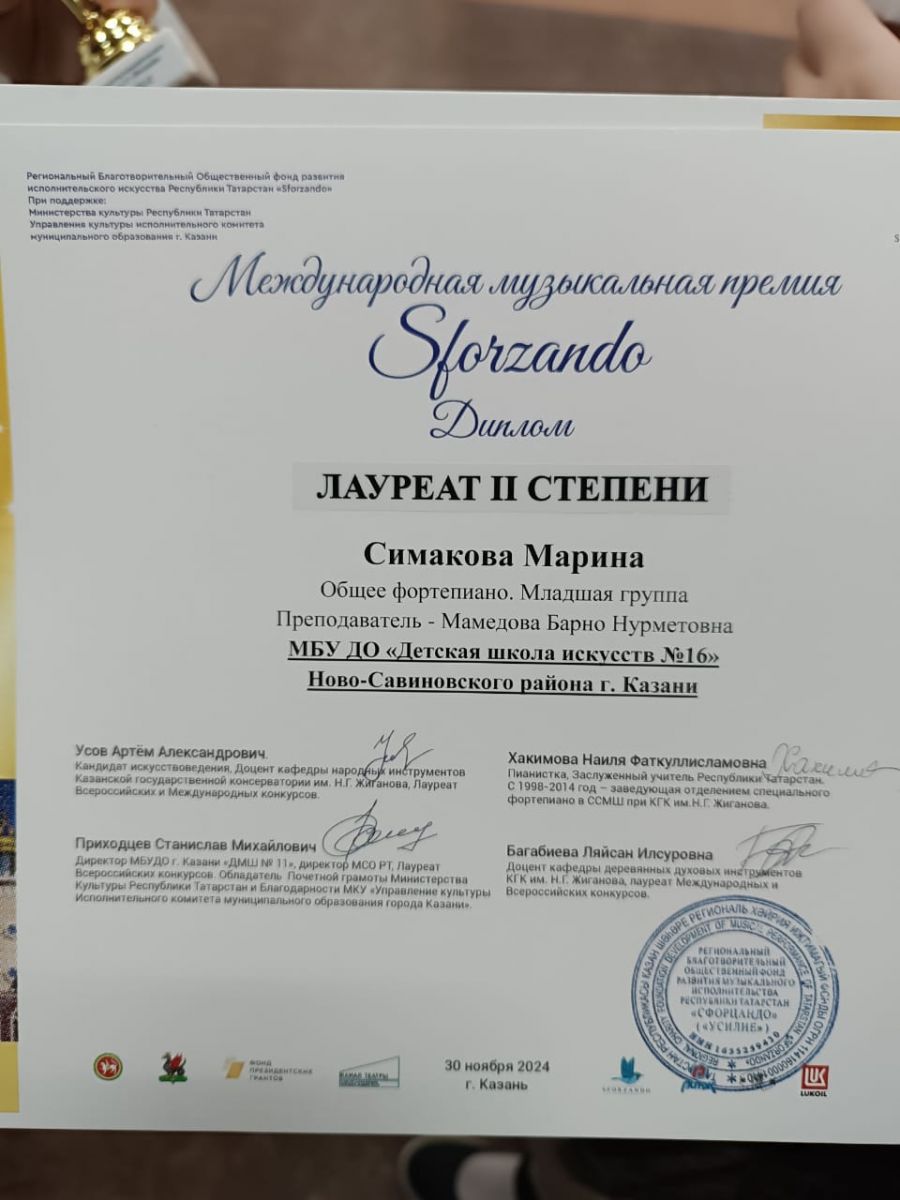 5. Симакова Марина - лауреат 2 степени. «Международная музыкальная премия Sforzando»