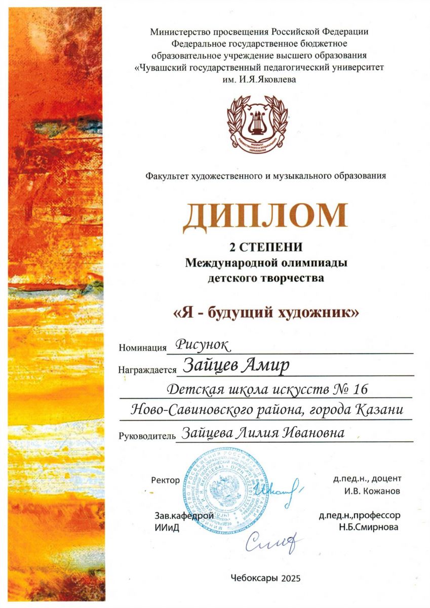52. Зайцев Амир - диплом 2 степени. Международная олимпиада детского творчества «Я – будущий художник»