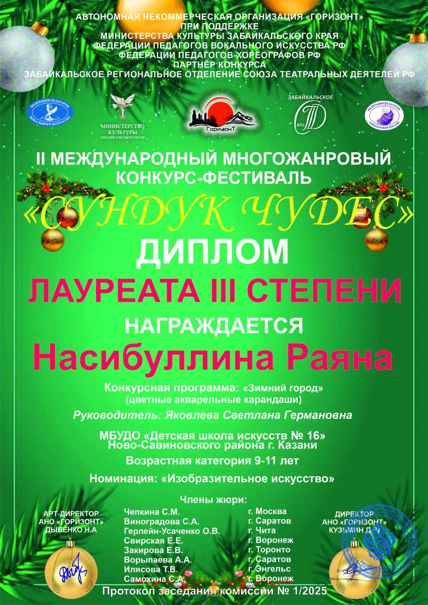 28. Насибуллина Раяна - лауреат 3 степени. Международный многожанровый конкурс-фестиваль «Сундук чудес»