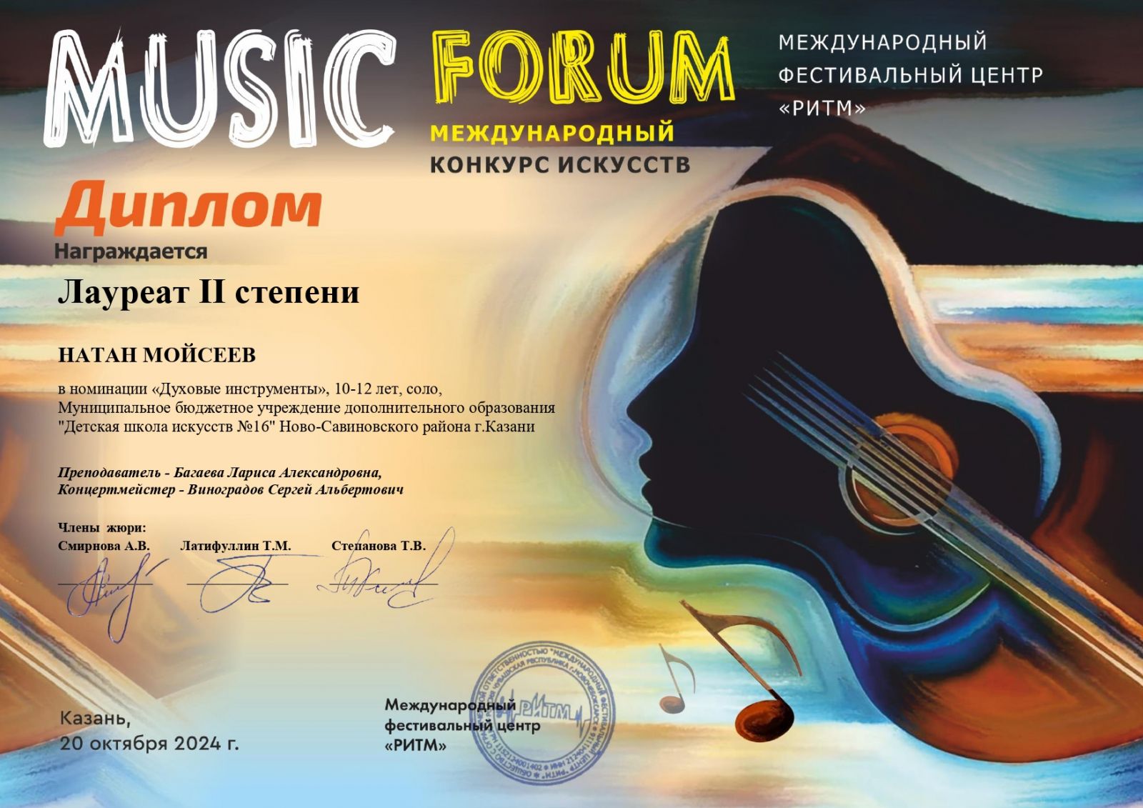 3. Мойсеев Натан - лауреат 2 степени. Международный конкурс искусств «Music forum»