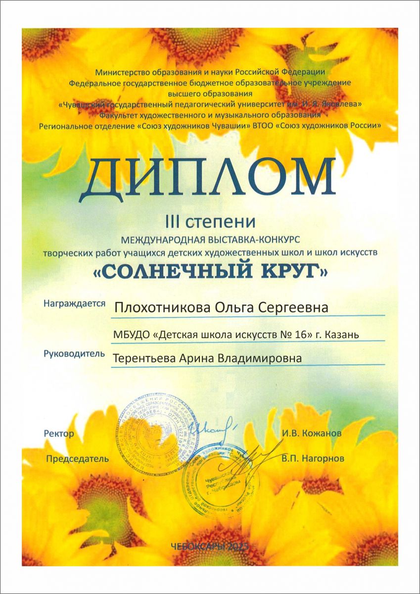 42. Плохотникова Ольга. Диплом 3 степени. Международная выставка-конкурс «Солнечный круг»