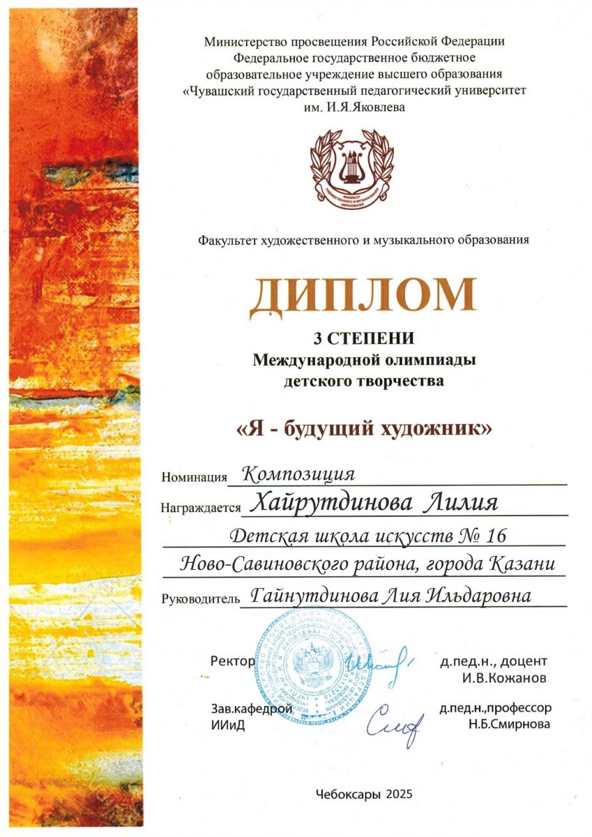 53. Хайрутдинова Лилия - диплом 3 степени. Международная олимпиада детского творчества «Я – будущий художник»