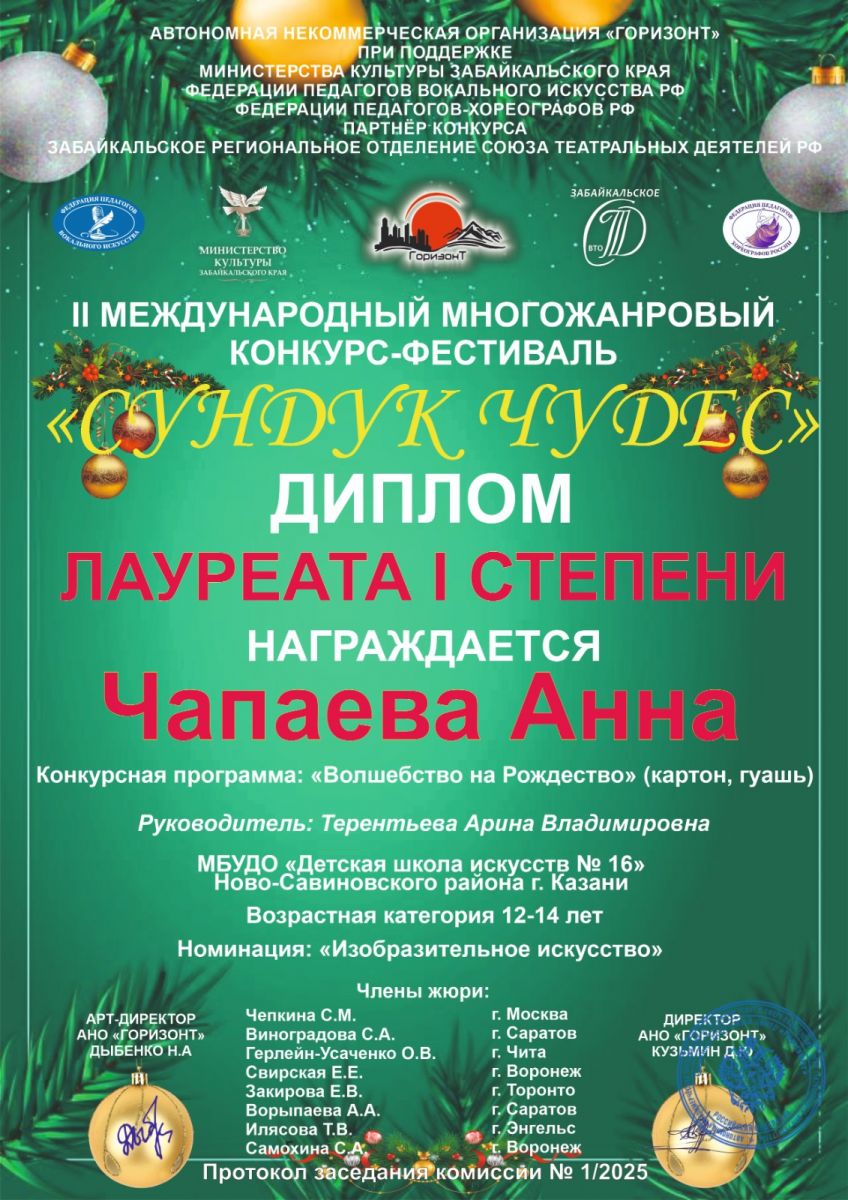 31. Чапаева Анна - лауреат 1 степени. Международный многожанровый конкурс-фестиваль «Сундук чудес»