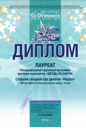 Диплом лауреата сводному старшему хору "Науруз" за участие в творческой программе "Звезды из завтра"