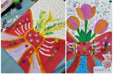 Рисовали на занятиях подарочные рисунки - большие красивые банты с цветами, мимозой или тюльпанами на выбор учащегося. Также выполняли подарочную открытку - декорировали зип-пакет, который сохраняет открытку с сюрпризом в виде чайного пакетика для приятного чаепития и на долгие воспоминания о весеннем празднике!