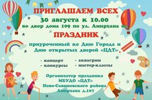 30 августа, в День Города, ЦДТ провел яркий праздник для жителей микрорайона. Красочные концертные номера организовали педагоги и учащиеся художественно- эстетического и отдела национальной культуры, педагоги декоративно- прикладного одела провели мастер-класс по изготовлению "игрушки-развивашки", аквагрим "Российский и Татарстанский флаги" и роспись в технике "Мехенди", педагоги спортивного отдела провели шахматный турнир.