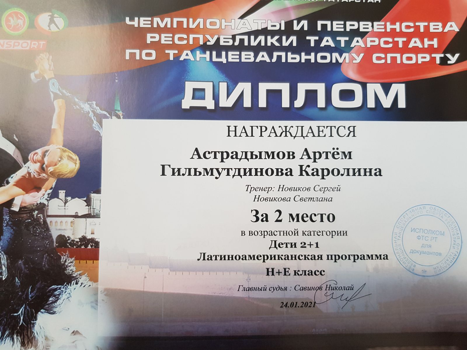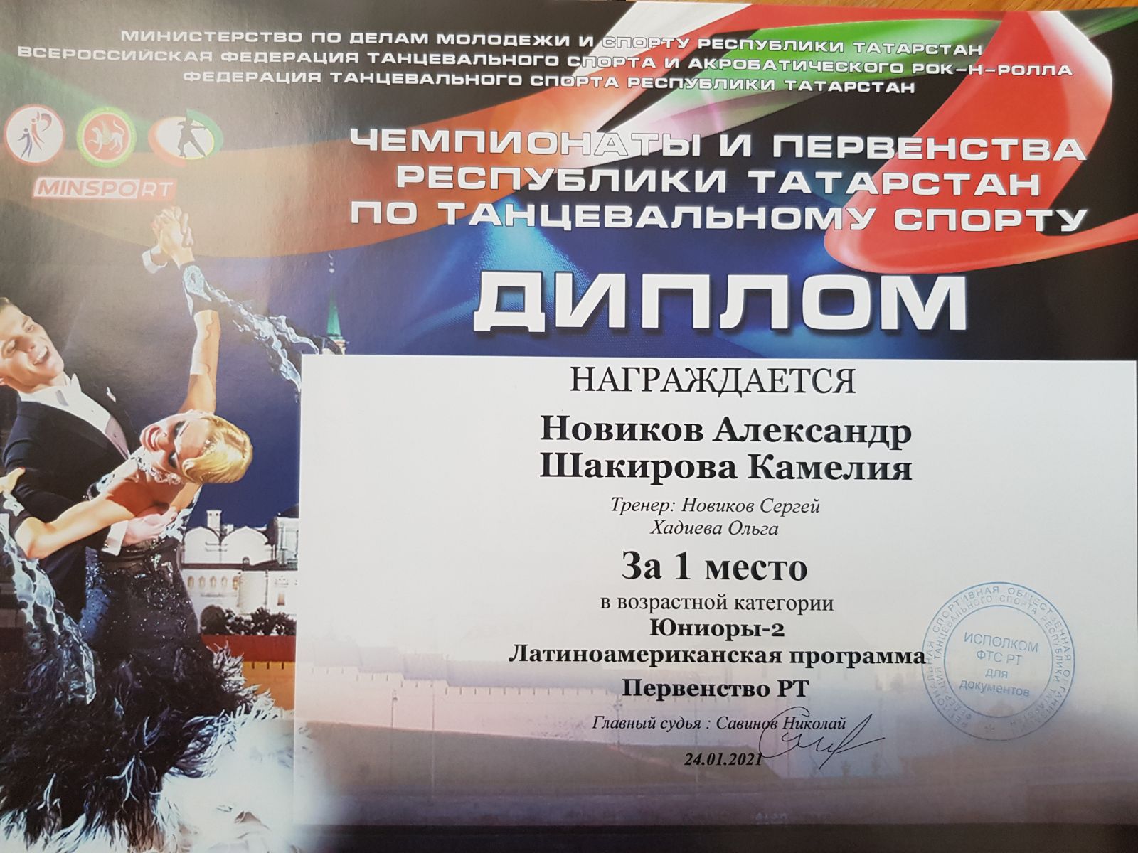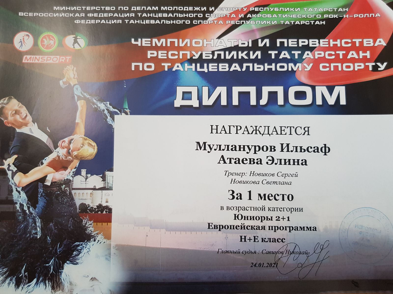 Поздравляем учащихся объединения «Dance-life» (руководители Новиковы Светлана Леонидовна и Сергей Викторович) с победой в Первенстве РТ по танцевальному спорту, прошедшему 24 января 2021г.в г.Казани.