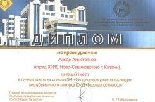 Поздравляем победителя в республиканском конкурсе «Безопасное колесо -2019» среди юных инспекторов движения Республики Татарстан учащегося детского объединения «ЮИД» Ахметзянова Ансара (педагог Храмов М.А.), занявшего 1 место в личном зачете на станции №4 «Фигурное вождение велосипеда» и с получением Диплома за 1 место.