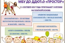 Дом детского и юношеского туризма и экскурсий «Простор» Ново-Савиновского р-на г. Казани приглашает детей от 5 лет в объединения на платной основе: «Ключ к знаниям» - программа предшкольной подготовки в которую входят: подготовка к чтению и письму, «математические ступеньки», «сохрани свое здоровье сам», аппликация, окружающий мир, музыка, английский язык, ИЗО; «Веселый фитнес» - игровые мероприятия под музыку, развитие всех групп мышц, исправление осанки, профилактика плоскостопии и др; «Разноцветная палитра» - освоение детьми первоначальных навыков работы в различных техниках изобразительного и декоративно-прикладного искусства; «Развитие танцевальных способностей» - комплексный курс, направленный на формирование музыкально-танцевальных, ритмических представлений; «Каратэ Кёкусинкай» - развитие внимания, понятийного аппарата, волевого контроля. Ждем всех желающих по адресу: г. Казань, ул. Адоратского, д. 5а. Наш телефон 556-08-56 25.08.2017