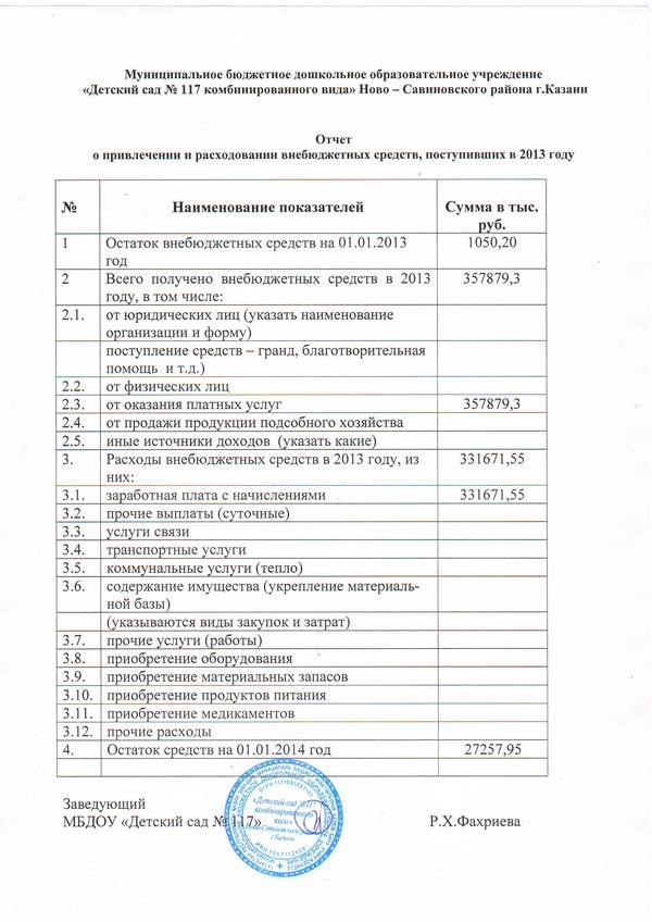 Отчет о привлечении и расходовании внебюджтных средств, поступивших в 2013 году