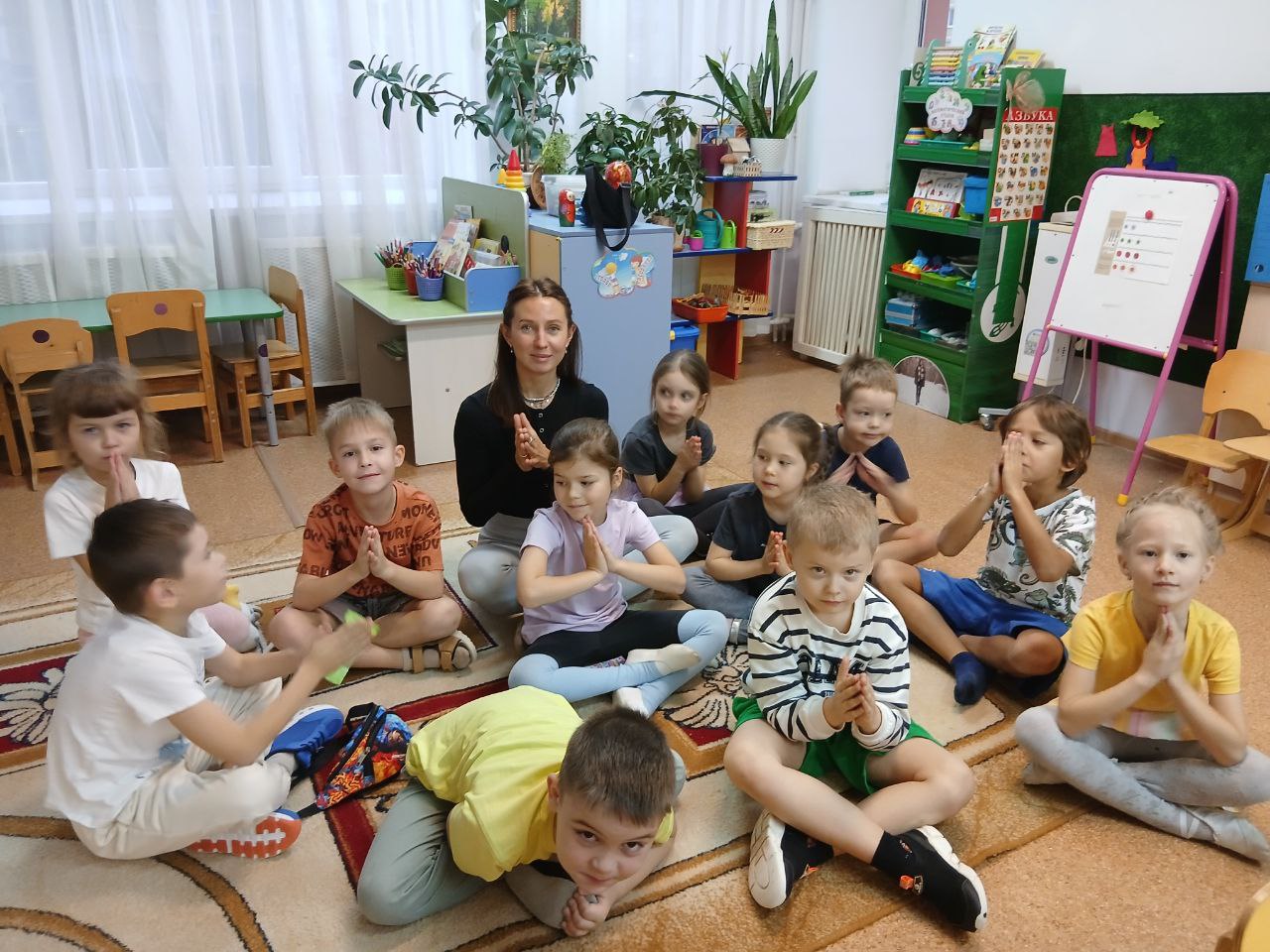 Нашей последней гостьей была мама Нурпеисова Сэма - Ксения Владимировна, которая работает инструктором йоги. Она рассказала детям об основных позах йоги, показывая карточки с их изображением.
