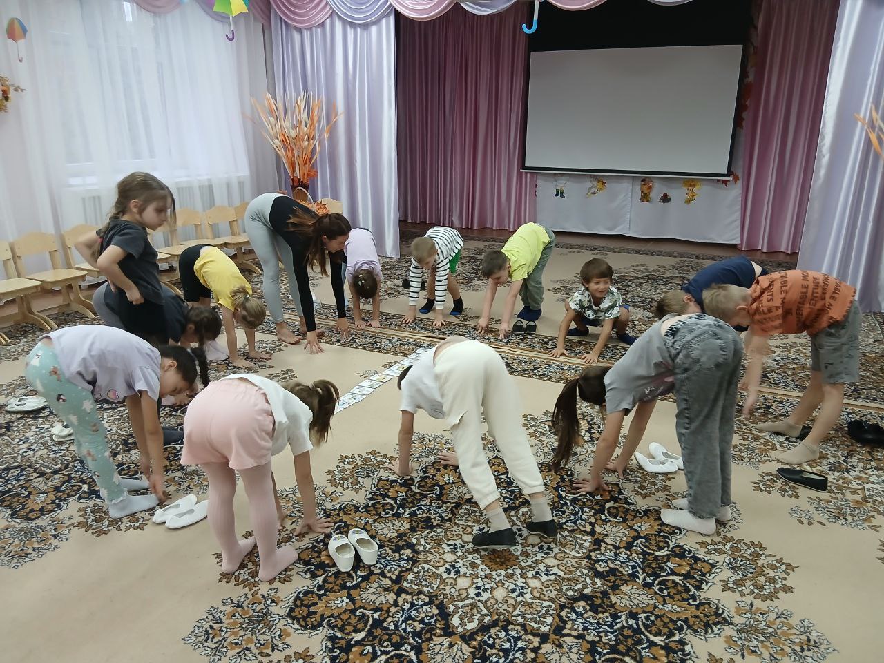 Дети вместе с ней делали дыхательные упражнения и на растяжения стоп. Они освоили основные позы йоги. С большим азартом вставали в позы кошки, шипели и извивались как змеи, порхали как бабочки. В самом конце занятия дети отдыхали лежа в позе отдыха и расслабления, слушая при этом звуки природы.