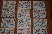 Для работы понадобится: лист картона, цветные парные кружки, полоски цветной бумаги и клей.Для ребят придумали историю, превращения цветной бумаги в веселых червячков. Для этого нужно сначала наклеить на лист картона все кружочки.С помощью цветных полосок соединить кружочки, но нужно помнить, что каждая полосочка может соединить только кружочки своего цвета. Для того, чтобы соединить все кружочки, нужно подумать, какие-то полоски будут пересекаться и создавать лабиринты, но это же наши будущие червячки, они легко с этим справятся. Ну вот и готово, теперь дела за малым, рисуем глазки, нос и рот. Весёлые червячки готовы.