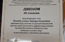 Линара Озодовна получила диплом III степени за участие в конференции.
