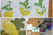 Цель: Учить детей создавать образ репки в технике обрывной аппликации: приклеивать кусочки цветной бумаги на готовый силуэт.