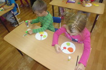 Цель: Продолжать учить детей аккуратно вырезать детали фруктов, наклеивать их на бумажную тарелку.
