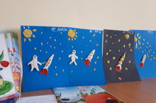12 апреля в нашем детском саду прошел день Космонавтики. К этому событию готовились все группы: проводили беседы, рассматривали иллюстрации, делали рисунки, аппликации, панно. В старших группах проводились беседы о космосе, также мы рассматривали иллюстрации связанные с космосом и фотографии Юрия Гагарина - первого человека, побывавшего в космосе. Также мы организовали выставку, посвященную Дню Космонавтики.