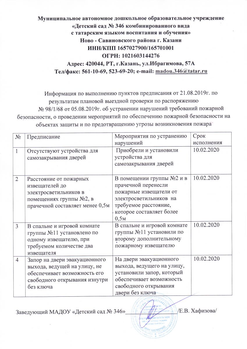 Отчет об исполнении предписания УНД и ПР ГУ МЧС России по РТ от 20.08.2019