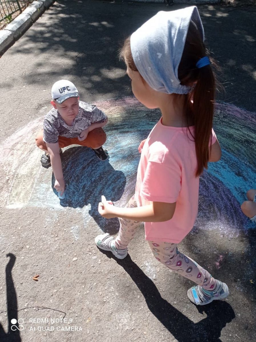 Воспитатели вместе с воспитанниками окунулись в радужные краски, нарядились в разные цвета. Ребята поиграли в подвижную игру «Солнышко и дождик», «Цветные автомобили». В завершении тематического занятия дети нарисовали коллективный рисунок на асфальте мелками - «Разноцветная радуга».