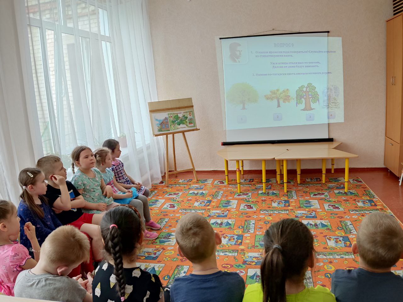 Ежегодно в детском саду отмечается день рождения Габдуллы Тукая. К этому празднику воспитанники учат стихи, читают сказки. В рамках празднования 137 - летия татарского поэта Г. Тукая, воспитанники логопедической группы № 6 приняли участие в викторине "Мы читаем, мы все знаем", посвященную творчеству поэта и знания татарского языка. В ходе викторины дети находили картинки соответствующие стихотворению "Озорной котенок", вспоминали чему учит мальчик Акбая в стихотворении "Забавный ученик", отгадывали загадки. Называли на татарском языке цвета осенних листьев по стихотворению "Четыре времени года", играли в музыкально-ритмическую игру ""Давайте, потанцуем!"- "Әйдәгез, биибез!". Дети с удовольствием послушали песню "Шүрәле", "Бәйрәм бүген", исполнили песню "Туган тел". так же в детском саду была оформлена выставка рисунков по произведениям Г.Тукая.