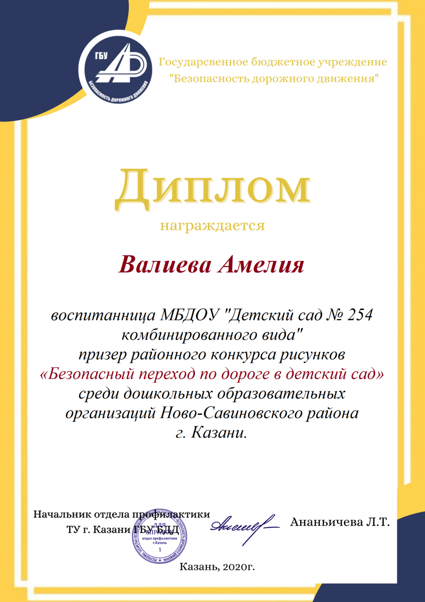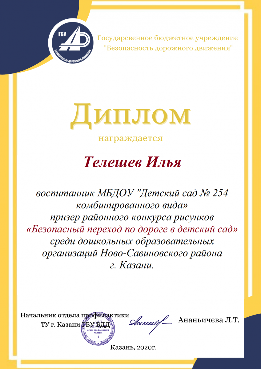 Поздравляем воспитанников детского сада Валиеву Амелию (10 группа) и Телешева Илью (10 группа). Они стали призерами районного конкурса рисунков "Безопасный переход по дороге в детский са" среди образовательных организаций Ново-Савиновского района г. Казани.