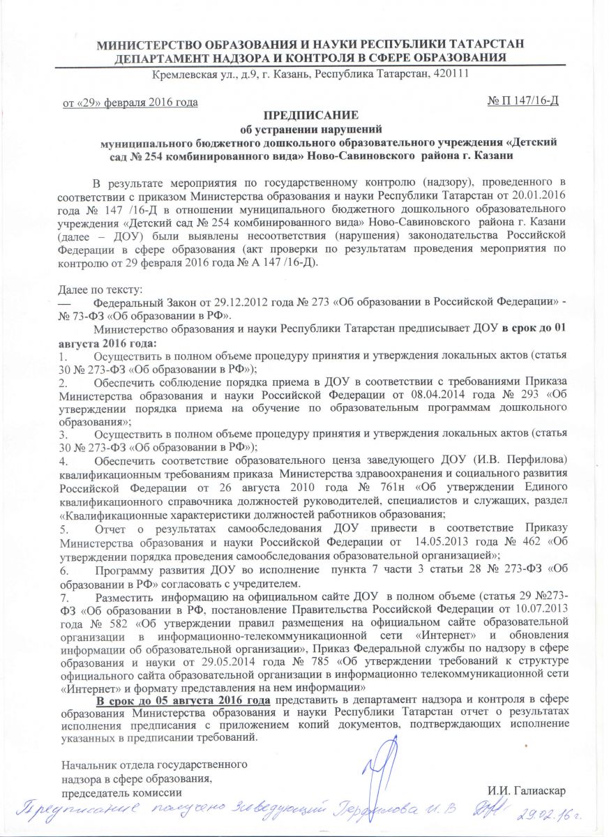 Предписание Министерства Образования и Науки Республики Татарстан Депортамент надзора и контроля в сфере Образования