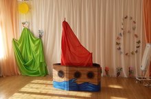 Воспитанники группы № 5 отправились сегодня на корабле за сокровищами для мам и бабушек. Увлекательное путешествие сопровождалось трогательными песнями и стихами, забавным танцами моряков и пиратов, конкурсами, в котором учавствовали мамы. В конце путешествия был найден сундук с подарками для мам и бабушек.