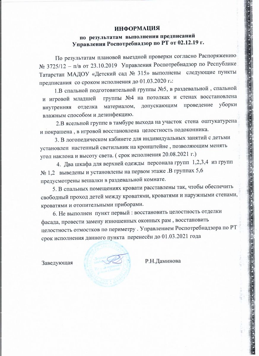 Отчёт о выполнении предписания управления Роспотребнадзор от 02.12 2019