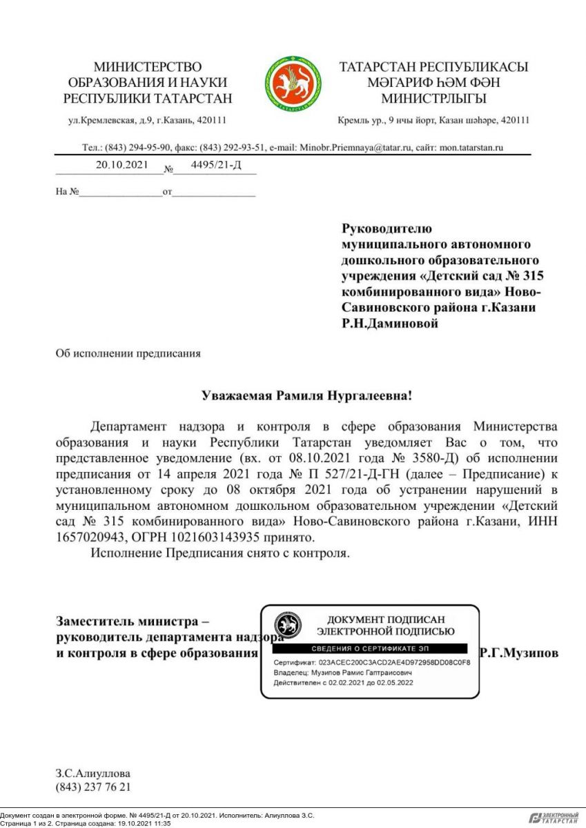 Уведомление № 4495/21-Д от 20.10.2021 о снятии предписания № П 527/21 Д-ГК с контроля