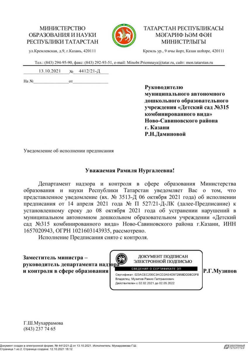 Уведомление № 4412/21-Д от 13.10.21 о снятии предписания № П 527/21 Д-ЛК с контроля