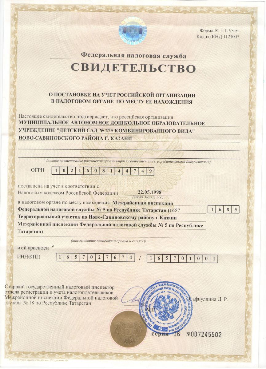 Свидетельство о постановке на учет Российской организации в налоговом органе по месту ее нахождения