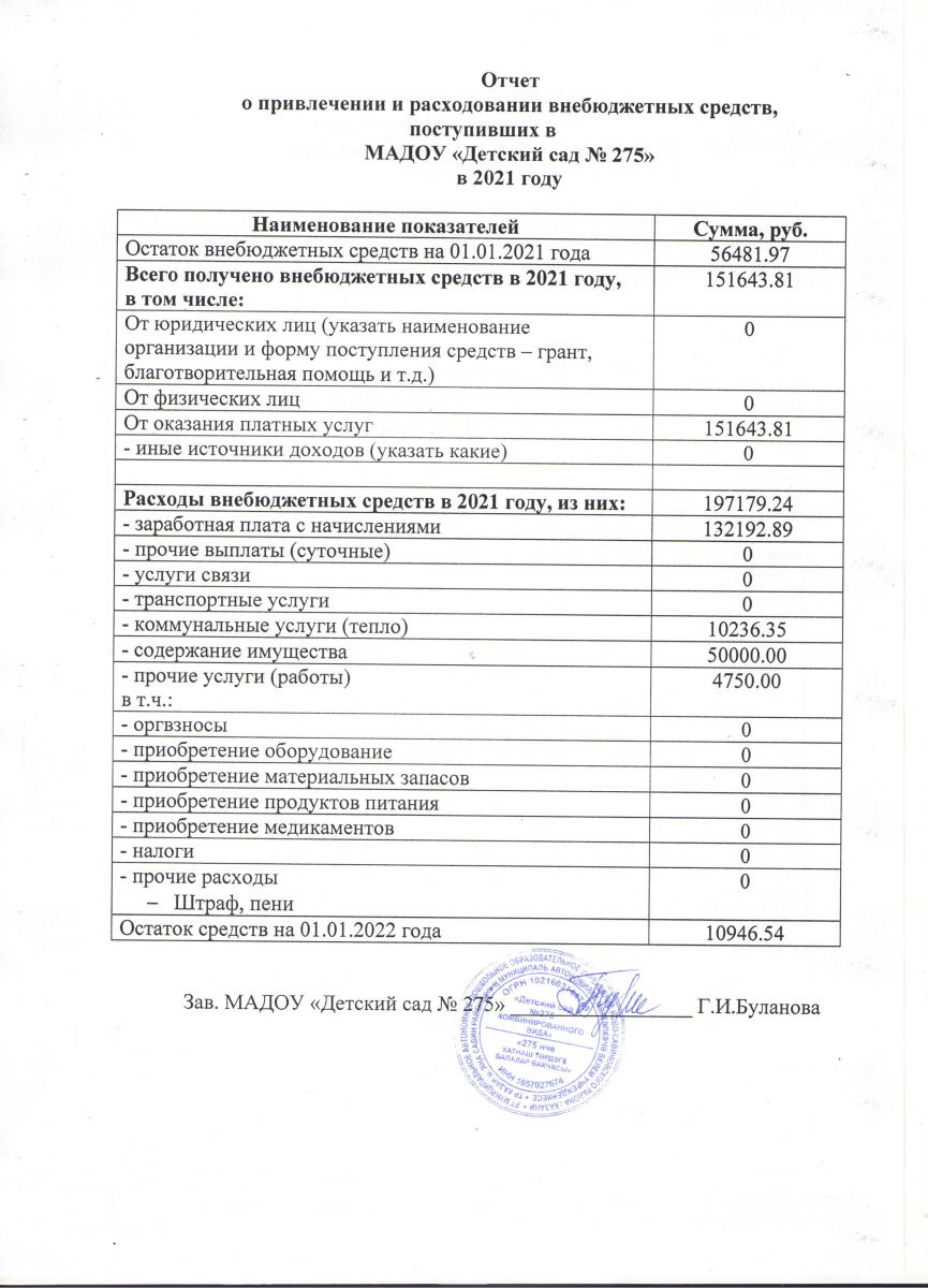 Отчет о привлечении и расходовании внебюджетных средств, поступивших в МАДОУ «Детский сад № 275» в 2021 году