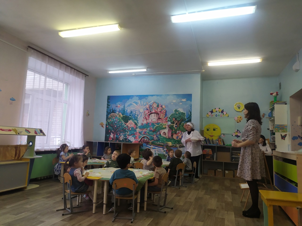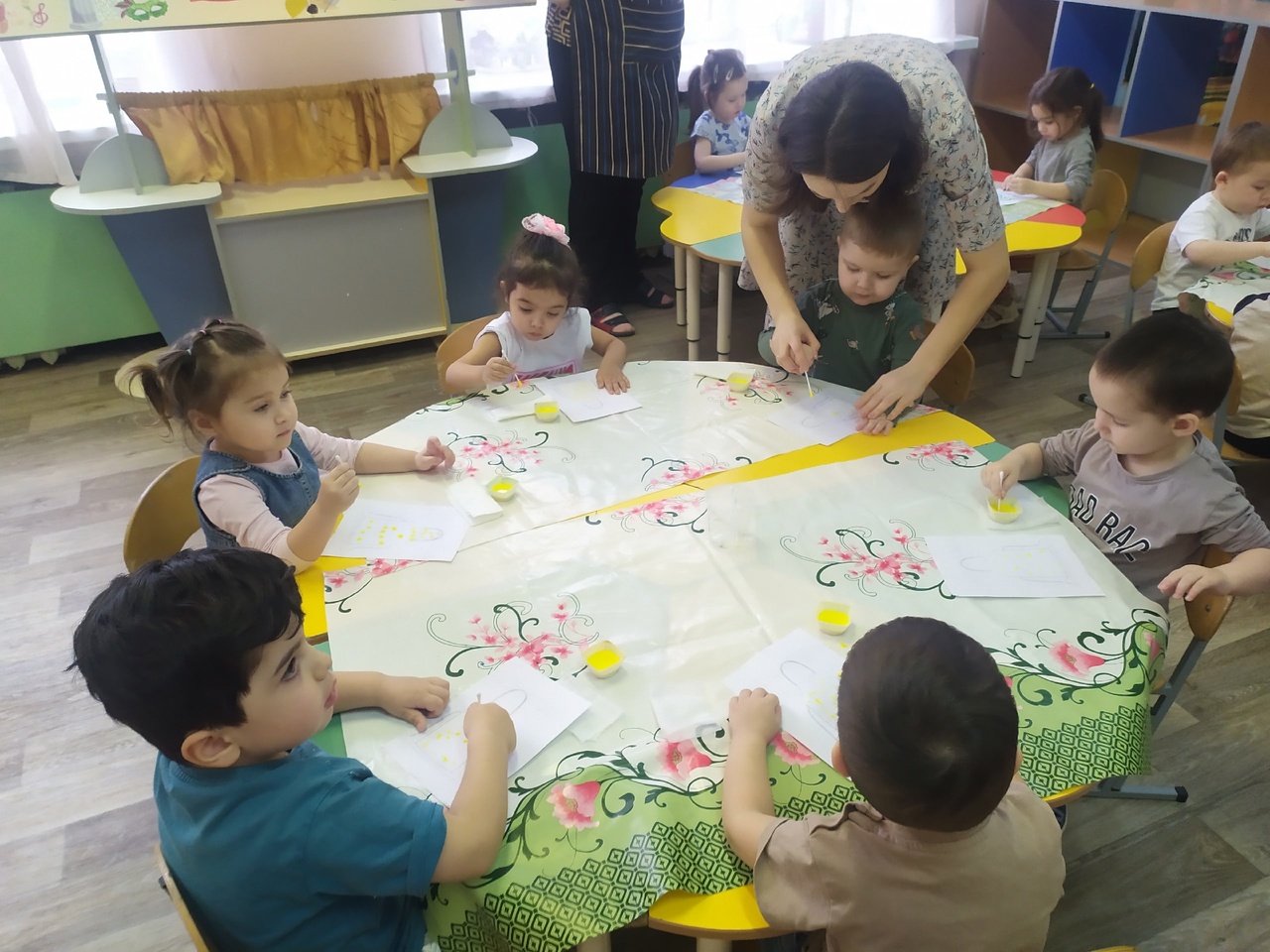 В первой младшей группе Ризаля Айратовна и Лилия Юсупхановна организовали занятие по рисованию, где дети использовали нетрадиционные способы и украшали фартуки для повара.