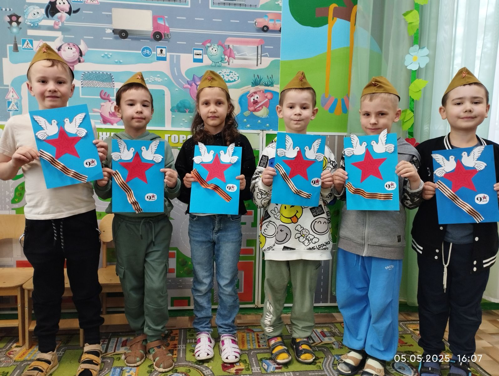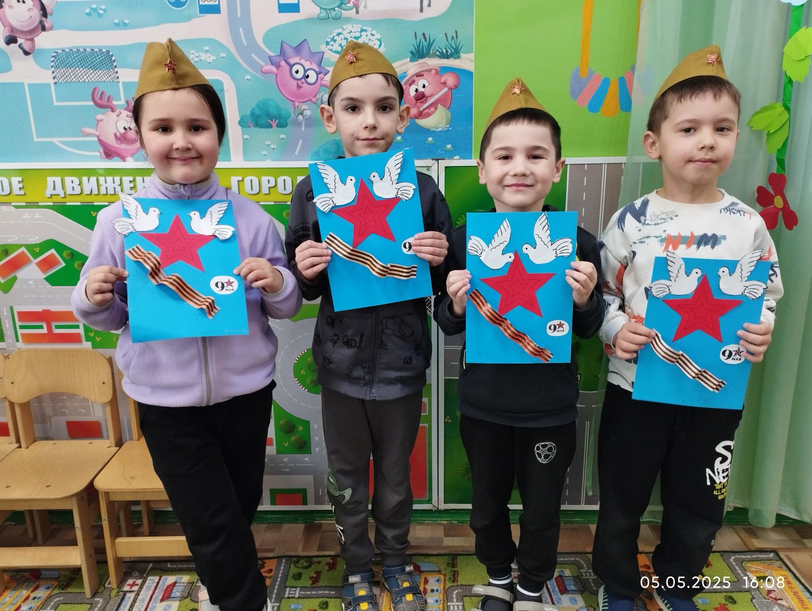 С целью воспитания у детей патриотических чувств, интереса к ее героическому прошлому, уважения к павшим защитникам Родины, дети вместе с родителями и воспитателями нарисовали рисунки, сделали поделки к празднику «День Победы!»