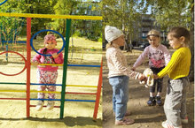 На прогулке дети играют, много двигаются. Движения усиливают обмен веществ, кровообращение, улучшают аппетит. Для развития основных видов движений у детей: бега, прыжков, метания, лазания, воспитатели (конечно же, с помощью родителей!) превратили прогулочные участки в красочные спортивные площадки. Во время прогулки дети учатся преодолевать различные препятствия: перешагивать через пенечки, шагать по «болотным кочкам», проходить лабиринты, или просто играть в подвижные и сюжетные игры.