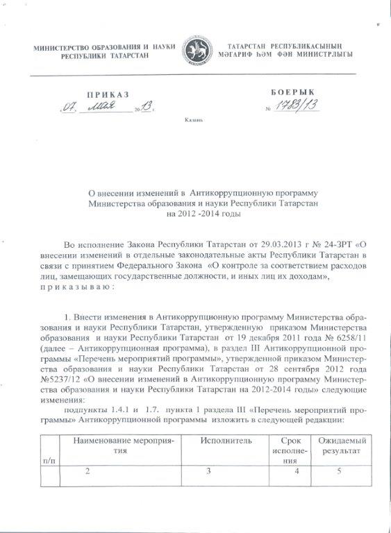 10. Приказ МОиН РТ от 07.05.2013 г. № 1783/13 "О внесении изменений в Антикоррупциооную программу МОиН РТ на 2012 - 2014 гг." /upload/storage/org2957/files/приказ 1723.jpg