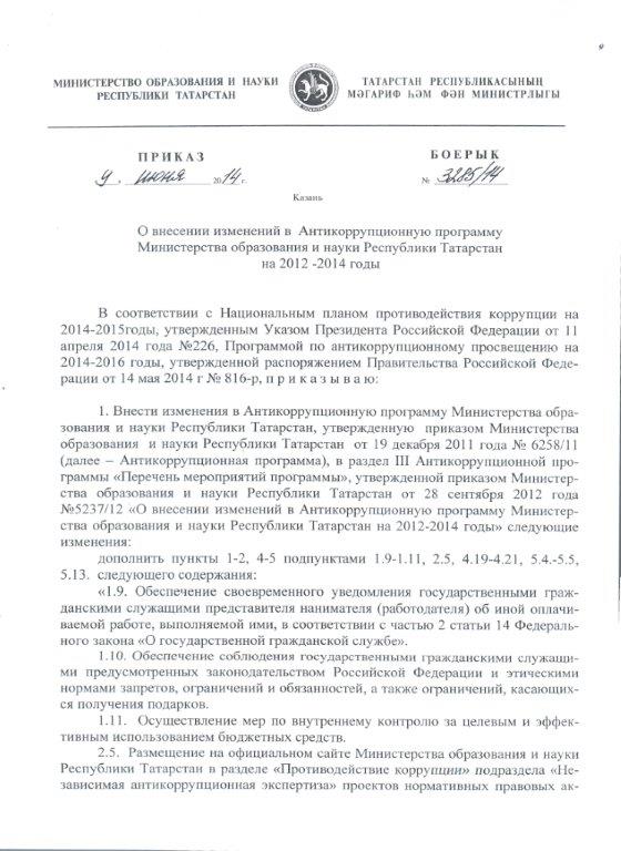 11. Приказ МОиН РТ от 09.06.2014 г. № 3285/14 "О внесении изменений в Антикоррупционную программу МОиН РТ на 2012-2014 гг." /upload/storage/org2957/files/приказ 3285.jpg