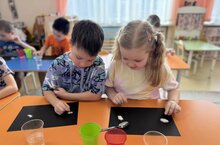 Сегодня в детском саду - научный день. Старшие дошкольники занимались познавательно-исследовательской деятельностью, проводили опыты с водой, а малыши наблюдали изменения в природе зимой.